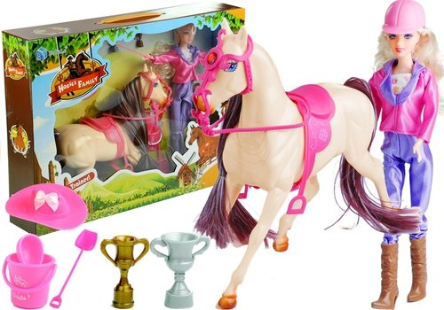 Zestaw stajnia - lalka i koń Prezentowany zestaw składa się z dużego, białego konia, lalki-trenerki oraz wielu akcesoriów, które są niezbędne do pracy w stajni. Biały koń o imponującym rozmiarze posiada piękną grzywę i ogon, które nie tylko błyszczą, ale są niebywale przyjemne i miękkie w dotyku. Dziewczynka będzie mogła przeczesywać grzywę specjalnym grzebieniem, by następnie móc ozdobić konia warkoczami lub innymi, wymyślonymi przez siebie fryzurami. Biały koń posiada miękkie siodło, które ozdobione jest eleganckimi ornamentami, a także uprząż z brylantem, połączoną z lejcami. Lalka trenująca konia posiada smukłą sylwetkę i długie, lekko kręcone włosy. Ubrana jest w dwuczęściowy strój z połyskującego materiału, który można urozmaicić dołączonymi do zestawu kowbojkami na obcasie. W zestawie znajduje się czapka dżokejska, w którą można ubrać lalkę, gdy jeździ na koniu, oraz kapelusz z szerokim rondem, przydatny podczas szczotkowania i opieki nad zwierzęciem. Duży kosz piknikowy zmieści do środka przysmak konia, czyli marchewki, a także zdobyte trofea. W komplecie znajdują się również grabie, konieczne podczas sprzątania w stajni. Ten wieloelementowy komplet posiada wszystko, co jest potrzebne do udanej zabawy. Dziewczynka może zajmować się koniem, karmić i czesać go, a także organizować wesołe pikniki. Zestaw zapakowany jest w wielokolorowe kartonowe pudełko z witrynką, co sprawia, że doskonale nadaje się na prezent. Ze względu na rozmiar niektórych elementów, zabawka z certyfikatem CE przeznaczona jest dla dzieci, które ukończyły 3. rok życia. W skład zestawu stajni wchodzą: - biały koń, - lalka, - koszyk na akcesoria, - pęk marchewek, - kapelusz, - czapka dżokejska, - buty na obcasie, - szczotka, - grzebień, - grabie, - złoty i srebrny puchar. Wymiary poszczególnych elementów zabawki: - koń: 30 cm x 25 cm, - lalka: 30 cm, - kosz na akcesoria: 8,5 cm x 5,5 cm, - grabie: 15,5 cm. Wymiary opakowania: - 34,5 cm x 9 cm x 47 cm.