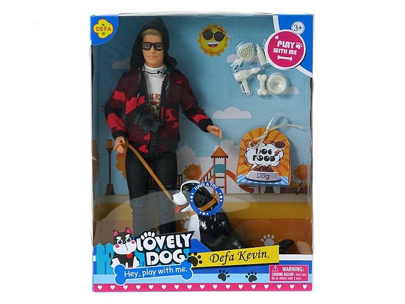 lalka 29cm, Kevin z psem szczekającym 12x5,5x5cm, zginalne kończyny, rozpinana kurtka, akcesoria dla psa; W/B