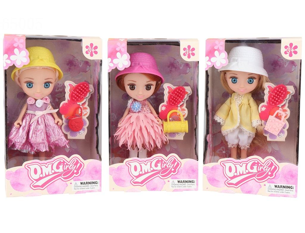 Laleczka w kolorowej sukience z torebką i szczotką do włosów.