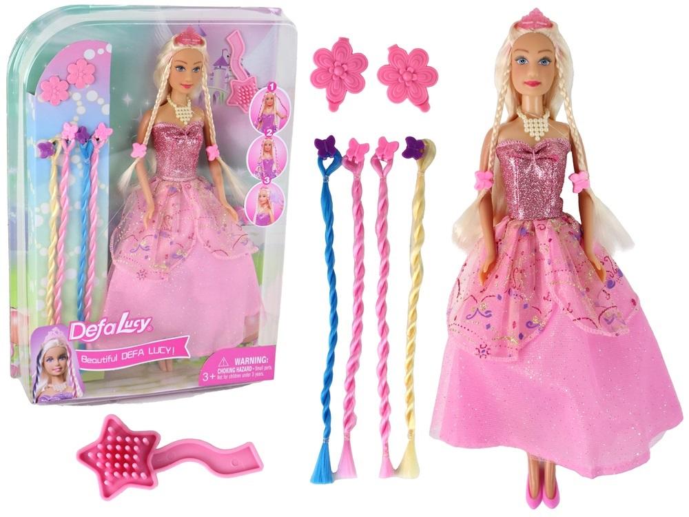 Góra sukienki jest brokatowa w kolorze różowym, co sprawia, że wydaje się jak prawdziwa królewska kreacja.Dół sukienki jest również w kolorze różowym, ozdobiony błyszczącymi elementami, które pięknie mienią się w świetle. Na nogach ma delikatne różowe czółenka, które doskonale pasują do jej sukni.W zestawie znajduje się różowa szczotka, która pozwala na pielęgnację i układanie włosów lalki. Spinki do włosów w kolorze różowym pozwalają na tworzenie różnych fryzur i ozdabianie włosów lalki. Dodatkowo w zestawie są 4 pasma doczepianych włosów o różnych kolorach: różowe, niebieskie i w kolorze blond, co daje możliwość eksperymentowania z fryzurami i stylizacjami.Lalka księżniczka to idealna zabawka dla małych miłośniczek bajek i marzeń o byciu królewną. Jej piękny wygląd i bogaty zestaw akcesoriów pozwalają na tworzenie różnych historii i kreatywną zabawę, rozwijając wyobraźnię i kreatywność dzieci. To także okazja do nauki dbania o włosy i stylizacji.