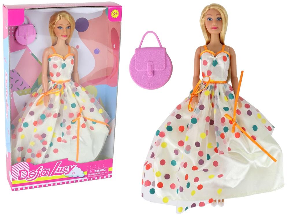 Lalka Lucy Księżniczka W Białej Długiej Sukni Lalka Lucy to prawdziwa uroda w świecie lalek. Jej długie blond włosy dodają jej uroku i elegancji. Na twarzy lalki znajduje się delikatny makijaż, który podkreśla jej piękno i dodaje uroku. Lucy wydaje się gotowa na wielką uroczystość lub wyjątkową okazję. Jednak to jej ubranie nadaje jej niepowtarzalny wygląd. Lalka ma na sobie długą białą sukienkę, która jest prawdziwym arcydziełem. Sukienka ozdobiona jest kolorowymi kropkami, które nadają jej radosnego charakteru. Wykończenia sukienki są w pomarańczowym kolorze, co dodaje kontrastu i energii całemu strojowi. Ta sukienka sprawia, że lalka Lucy wydaje się jak prawdziwa księżniczka. Na jej nóżkach ujrzymy białe, eleganckie buciki,a w jej dłoni elegancką, różową torebkę, która doskonale komponują się z całą stylizacją. Całość tworzy niesamowicie uroczy i elegancki wygląd, który zachwyca i inspiruje do różnorodnych zabaw i opowieści. Lalka Lucy to nie tylko zabawka, ale także piękna ozdoba, która może być częścią kolekcji lalek lub cennym prezentem dla małej dziewczynki. Jej wyjątkowy wygląd i staranne wykonanie z pewnością przyciągną uwagę każdego, kto ją zobaczy. Zawartość zestawu : -lalka Lucy - torebka -oryginalne opakowanie Wymiary lalki : 31 cm x 6 cm Wymiary opakowania : 31 cm x 18 cm x 5 cm Zgodny z normą EN71 i certyfikatem CE. Przeznaczony dla dzieci powyżej 3 roku życia.