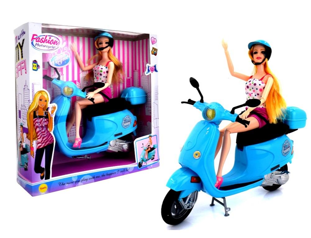 "Urocza lalka na skuterze uwielbia przejażdżki po okolicy. Lalka ma zginane dłonie, ręce oraz nogi, dzięki temu można ją łatwo ułożyć na skuterze i podczas innych zabaw. Składane nóżki pozwolą zaparkować motocykl po zakończonej przejażdżce.
