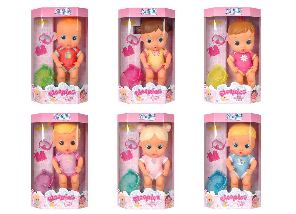 Lalka z płetwami i goglami do pływania. Funkcję: naciśnij lalkę na brzuszek i zanurz w wodzie z płynem. Wyjmij i pnownie naciśnij na brzuszek, a lalka wypluje wodę buzią i będzie robić bańki. Po założeniu maski będzie pluć wodą przez rurkę. Po zamoczeniu na kostiumie pojawi się ukryty deseń. 6 wzorów.