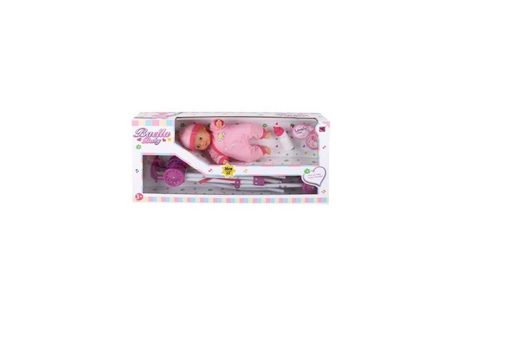 Lalka z wózkiem i butelką zapewni dziewczynkom doskonałą zabawę! Lalka wygląda bardzo realistycznie, wykonana jest z gumy i materiału. Ubrana w różowe śpioszki i czapeczkę.