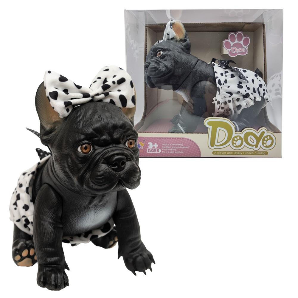 Lalka w formie czarnego buldoga francuskiego ma realistyczne detale, dzięki czemu wygląda jak prawdziwy szczeniak.
