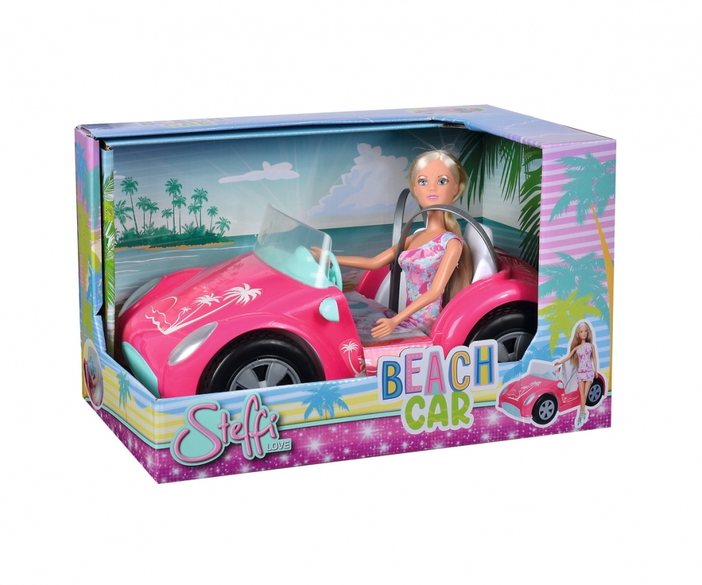 Steffi ubrana jest w modną, akwarelową sukienkę.Samochód plażowy ma obracające się koła, otwierany dach i siedzenia dla dwóch osób. Jest w kolorze różowym z turkusowymi elementami i białymi siedzeniami oraz srebrnymi kołami i ładnym, plażowym nadrukiem na masce i drzwiach, długość 29 cm.