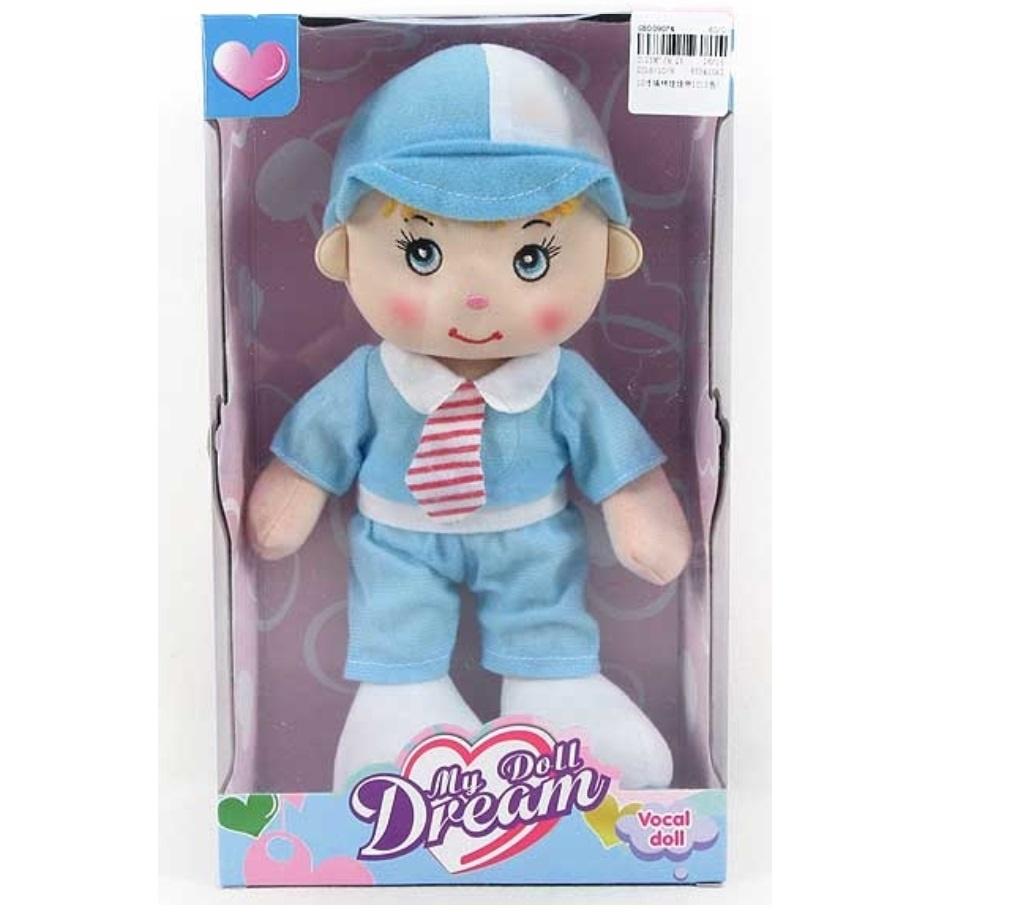 Szmaciana lalka o wysokości 26cm, zapakowana w pudełko.