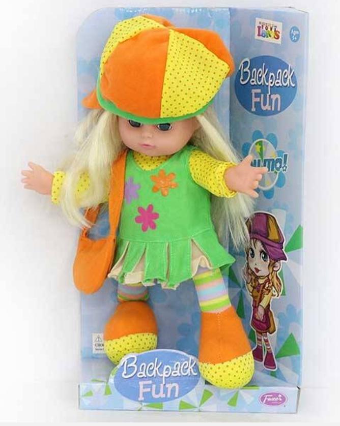 Lalka szmaciana z funkcją dzwięku 35 cm. Produkt potrzebuje baterii - w zestawie brak. Zabawka przeznaczona dla dzieci powyżej 5 roku życia.