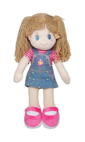 Lalka to blondynka uczesana w dwa kucyki, ubrana jest w T-shirt różowy w paski, dżinsową sukienkę w kwiatki i różowo-białe buciki.