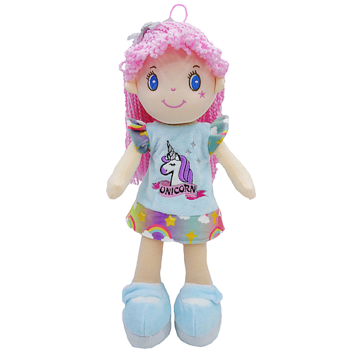 Lalka ma długie wełniane włosy w kolorze różowym, niebieskie wyszywane oczka i uśmiech na szmacianej buzi. Ubrana jest w kolorową, pluszową sukienkę z krótkim rękawkiem, z popiersiem jednorożca i napisem UNICORN. We włosy ma wpiętą srebrną kokardę. Lalka wykonana z dobrej jakości materiałów, starannie i precyzyjnie. Lalka bez dźwięku.