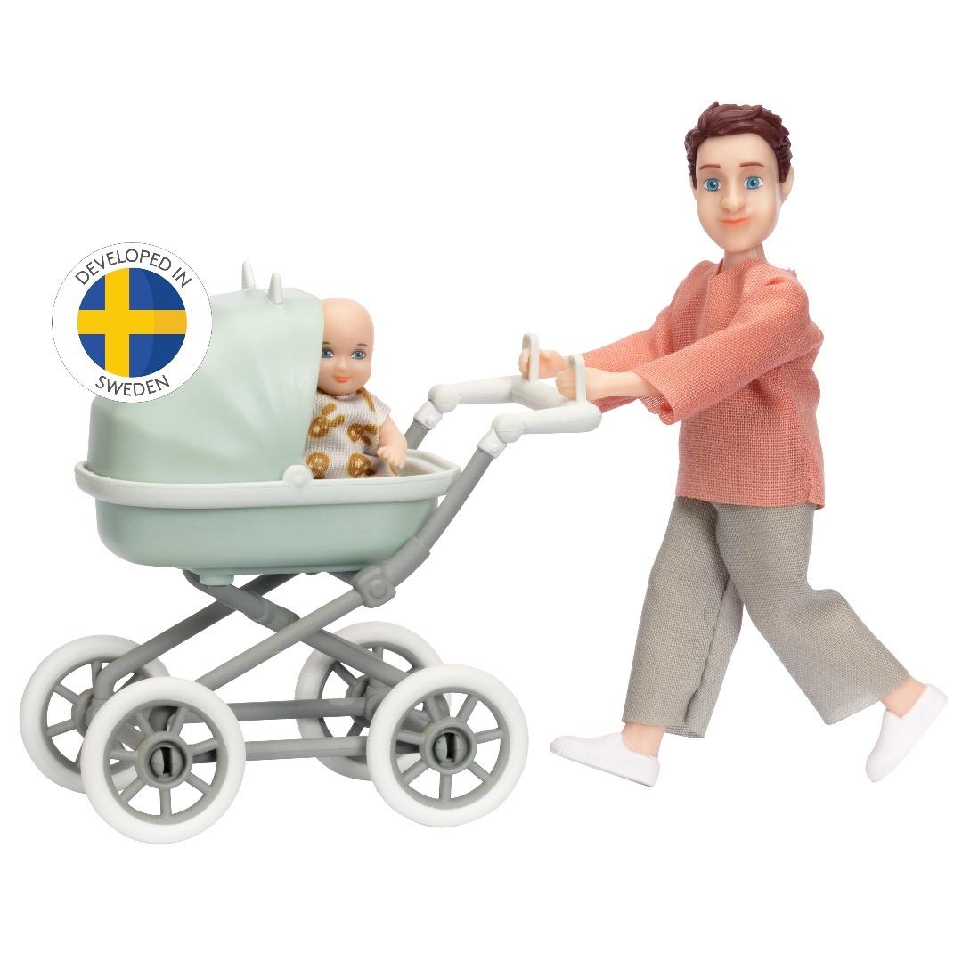 Zestaw zawiera dwie piękne lalki - stylowego tatę i uroczego bobaska, elegancki wózek i wygodny śpiworek. Wózek ma małe uszka, koła, które się kręcą i sprytne uchwyty dla rąk lalki dorosłej. Dach wózka można przesuwać do przodu i do tyłu.