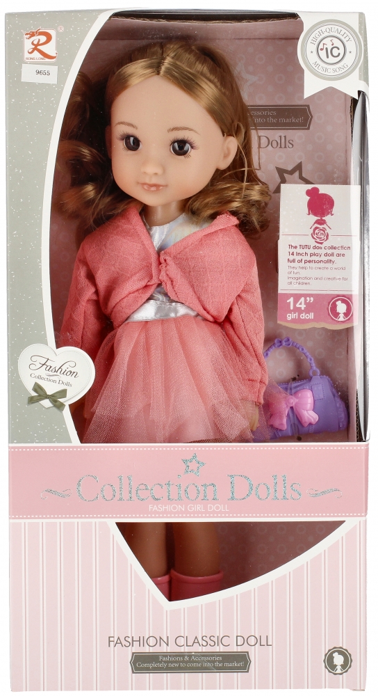 Zawartość zestawu lalka 36 cm w sukience, kalosze, szczotka, torebka.