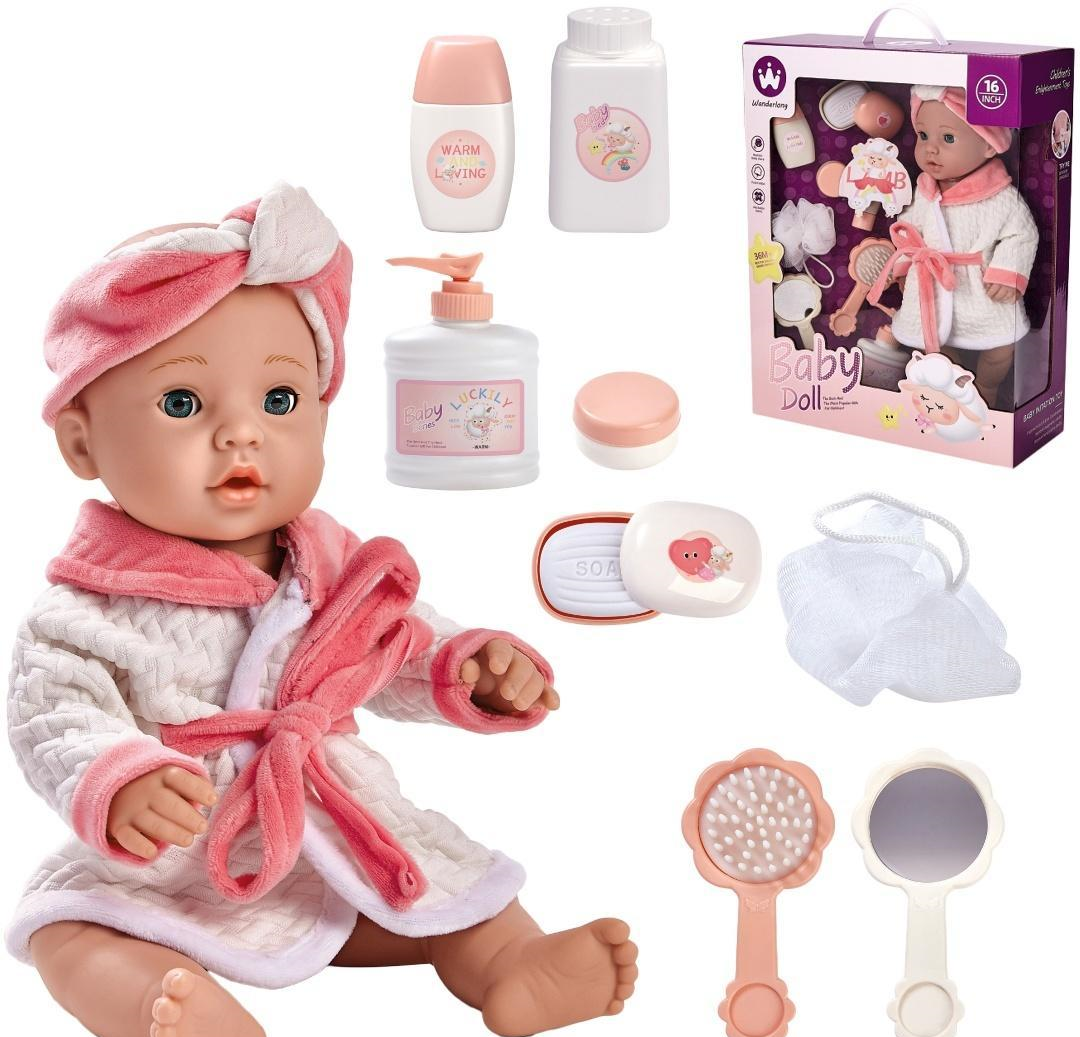 Zestaw Lalka Bobas z Akcesoriami do Kąpieli "Warm Loving Baby Doll" - Idealny do Zabawy w Pielęgnację! Opis produktu: Przedstawiamy uroczy zestaw "Warm Loving Baby Doll", który zachwyci każde dziecko marzące o opiekowaniu się własnym bobasem! Ta interaktywna zabawka nie tylko dostarczy godzin wspaniałej zabawy, ale także pomoże rozwijać empatię, poczucie odpowiedzialności i umiejętności społeczne. Co zawiera zestaw? Duża lalka bobas (ok. 16 cali/40 cm): Lalka ma realistyczne rysy twarzy, niebieskie oczy i uroczy wygląd. Jest ubrana w miękki, różowo-biały szlafrok z wiązaniem i pasującą opaskę na głowę z kokardką, idealną po kąpieli. Akcesoria do pielęgnacji: Kompletny zestaw akcesoriów, dzięki którym zabawa w kąpiel i pielęgnację staje się niezwykle realistyczna: o Butelka z balsamem "Warm Loving" o Pojemnik na puder o Mydło w mydelniczce o Butelka z pompką "Baby Suckkly" (prawdopodobnie na mydło w płynie lub balsam) o Pojemniczek z kremem o Gąbka do kąpieli o Szczotka do włosów (lub szczotka do masażu) o Lusterko Cechy, które zachwycą: Rozwój empatii i opiekuńczości: Zabawa z lalką bobasem i akcesoriami do pielęgnacji uczy dzieci odpowiedzialności, troski o innych oraz rozwija empatię. Realistyczna zabawa: Bogactwo akcesoriów pozwala na odgrywanie realistycznych scenek z codziennej opieki nad dzieckiem, co pobudza wyobraźnię i kreatywność. Wysoka jakość wykonania: Lalka i akcesoria są wykonane z trwałych i bezpiecznych dla dzieci materiałów, co zapewnia długie godziny bezpiecznej zabawy. Miękkie ubranka: Szlafrok i opaska wykonane są z przyjemnego w dotyku materiału, idealnego do przytulania. Idealny na prezent: Zestaw jest pięknie zapakowany w pudełko z okienkiem, co czyni go idealnym prezentem na urodziny, święta czy inne specjalne okazje. Przeznaczenie: Zestaw jest idealny dla dzieci, które uwielbiają bawić się w "dom" i opiekować się laleczkami. Wspiera rozwój społeczny i emocjonalny, a także umiejętności manualne. Wymiary lalki: Ok. 16 cali / 40 cm.