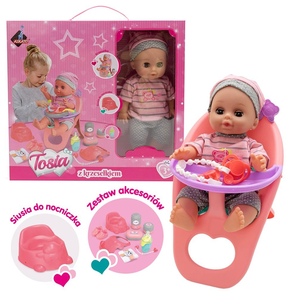 Pozwól swojemu dziecku wcielić się w rolę opiekuna z lalką Tosia z krzesełkiem do karmienia. Zestaw zawiera lalkę o wysokości 30 cm oraz bogaty zestaw akcesoriów, takich jak butelki, talerzyk, łyżeczki, nocniczek i wiele więcej. Krzesełko umożliwia realistyczną zabawę w karmienie, rozwijając kreatywność i zdolności motoryczne dziecka. To doskonały wybór dla małych opiekunów, którzy uwielbiają zabawę w dom i troskę o swoje lalki. Wysokość lalki: 30 cm