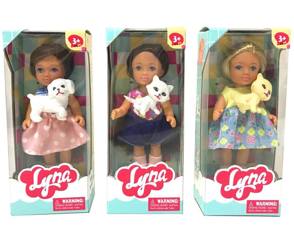 Urocza laleczka z długimi włosami w kolorowej sukience wraz ze swoim pupilem - pieskiem lub kotkiem
