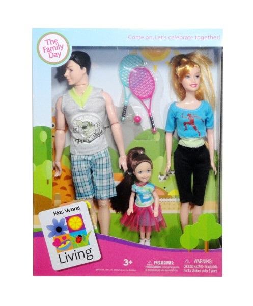 Zestaw lalek typu Barbie. W zestawie 3 lalki (kobieta, mężczyzna, dziecko) wraz z 2 rakietami do gry w tenisa z piłką. Produkt zapakowany w kartonowe opakowanie z przezroczystym okienkiem. Zabawka dla dzieci od 3 lat. Podane wymiary są wymiarami opakowania.