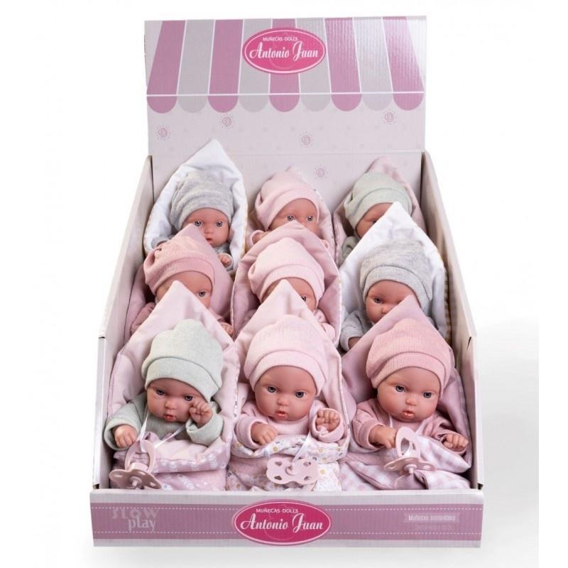 Zestaw Picolin 9 lalek ze smoczkami i śpiworkami 21 cm Antonio Juan 85318 Niewielkie, winylowe lalki hiszpańskie renomowanej marki Antonio Juan, umieszczone w elegancko wyglądającym biało-różowym standzie proponujemy szczególnie do sklepów stacjonarnych. 21-centymetrowe bobaski o uroczych twarzyczkach można ustawić w pobliżu kasy, aby przyciągnąć uwagę klientów i zachęcić do zakupu oryginalnego upominku. Lalki są starannie wykonane z dbałością o najdrobniejsze detale, co czyni je idealnym wyborem na prezent. Jednolite, ręcznie szyte ubranka w pastelowych kolorach i pasujące do buzi smoczki dodają uroku, sprawiając, że są one niezastąpionym elementem w każdej dziecięcej kolekcji zabawek. Zabawka przeznaczona dla dzieci od 2 roku życia.   W skład zestawu wchodzą:  pudełko  stand o wymiarach ok. 30x30x30 cm, 9 bobasów, ubranych w body z długim rękawem i czapeczkę, 9 śpiworków (rożków) w biało-różową kratkę, biało-żółtą kratkę oraz w różowe kropeczki, 9 smoczków.  Stand z lalkami hiszpańskimi jako ciekawa ekspozycja Stand można uzupełniać pojedynczymi lalkami z serii Picolin lub Mufly, co pozwala na nieograniczoną kreatywność w prezentowaniu kolekcji. Wszystkie te urocze bobasy wykonane są z gładkiego winylu, który jest przyjemny w dotyku i bezpieczny dla dzieci. Dzięki ruchomym kończynom i głowie lalki są niezwykle wszechstronne  można je przebierać, ustawiać w różnych pozach i zabierać do zabawy w kąpieli, co dodaje im dodatkowego uroku i funkcjonalności.  Te małe cudeńka zamiast zamykania w pudełku z wieczkiem, są przeznaczone do wyeksponowania, aby przyciągnąć wzrok i skraść serca maluchów oraz ich opiekunów. Stylowe i pomysłowe stroje, zaskakujące idealnie dobraną kolorystyką i detalami, sprawiają, że każda lalka hiszpańska wyróżnia się na swój sposób, oferując szeroki wybór niezależnie od gustu i preferencji. Dzięki temu zestawowi można stworzyć dynamiczną i atrakcyjną prezentację, która z pewnością zachwyci zarówno dzieci, jak i dorosłych.
