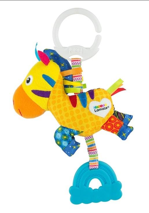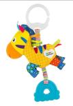 Kolorowa zawieszka z grzechotką i gryzakiem. Dzięki wykonaniu z materiałów o różnej fakturze, w jaskrawych kolorach oraz szeleszczącym elementom stymuluje dotyk, wzrok i słuch. Zabawka bez ograniczeń wiekowych.