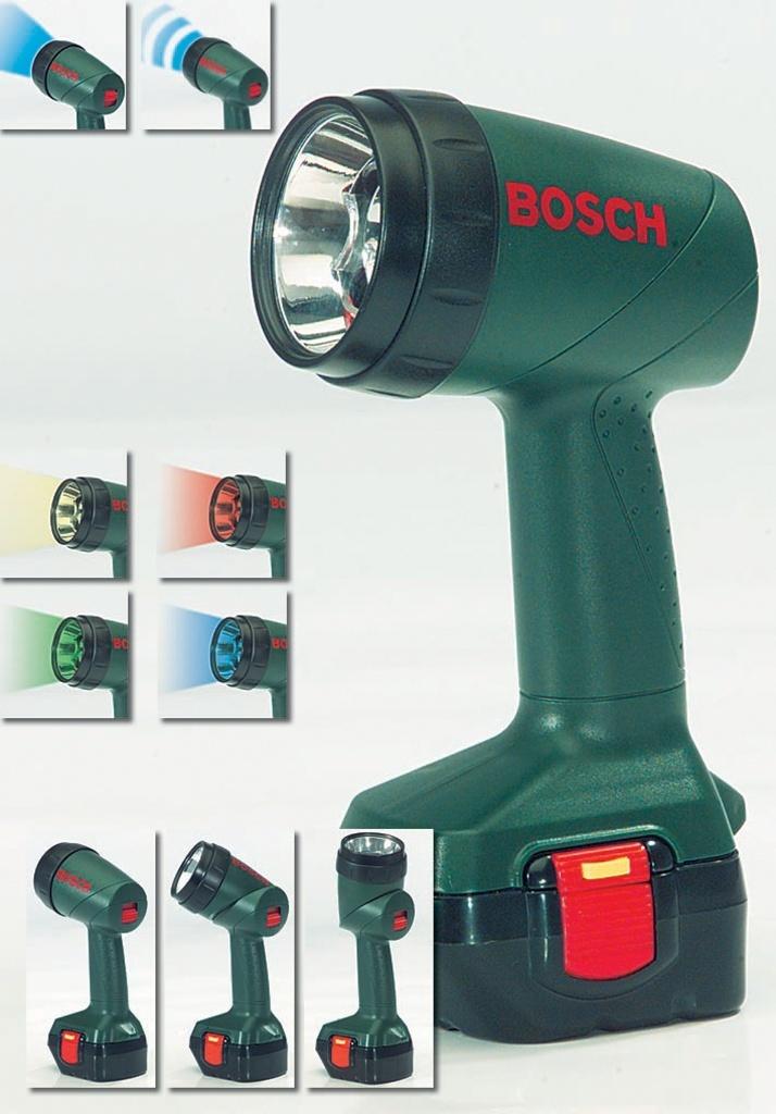 Lampa przegubowa marki Klein pochodzi z serii zabawek Bosch mini powstałej na licencji firmy Bosch, dlatego też jest kopią faktycznie istniejącego narzędzia tej marki. Lampa przegubowa jest w kolorze ciemno-zielonym z czarnymi elementami pierścienia latarki i akumulatora, a głowicę latarki ozdabia charakterystyczne czerwone logo Bosch. Lampę tę można postawić na dowolnej powierzchni płaskiej, dla przykładu na półce czy biurku. Lampa Bosch posiada tryby świecenia zarówno światłem ciągłym jak i światłem przerywanym co włącza się czerwonym przełącznikiem na głowicy latarki. Przełącznik ma 3 tryby : wyłączone, migające po wciśnięciu , włączone ciągłe. Ponadto lampa świeci światłem w czterech różnych kolorach, a zmiana koloru następuję po przekręceniu w prawo lub lewo czarnego pierścienia na głowicy. Kolory latarki to biały, czerwony, zielony i niebieski. Dodatkowo kąt głowicy możemy regulować w przegubie w 90 stopniach. Wszystkie elementy lampy są wykonane z plastiku, pozbawione ostrych krawędzi i całkowicie bezpieczne dla dziecka. Bawiąc się lampą przegubową dzieci już od najmłodszych lat w bezpieczny sposób będą mogły wcielić się w rolę majsterkowicza, zapewniając sobie realistyczne doświadczenie korzystania z tego narzędzia. Zabawka umożliwia maluchom kreatywną zabawę i doskonalenie umiejętności manualnych. Dzieci uwielbiają naśladować rodziców wykonujących codzienne czynności domowe lub w nich uczestniczyć, jednak nie zawsze jest to możliwe ze względów bezpieczeństwa, a dzięki tej całkowicie bezpiecznej dla dzieci, zabawkowej lampie / latarce każdy mały majsterkowicz może bezpiecznie robić to, co jego opiekunowie. Zabawka wymaga użycia baterii, które nie są zawarte w zestawie.