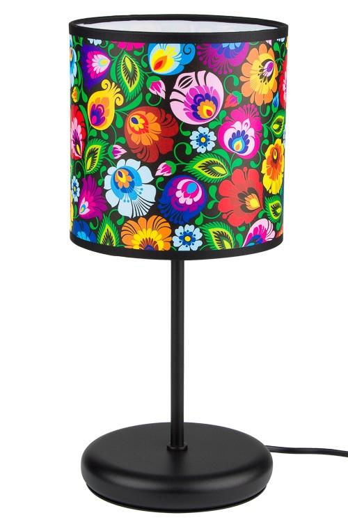 Łowicka lampa w ludowym stylu: abażur wykonany z tworzywa sztucznego z nadrukowanym łowickim wzorem ludowym (czarny z kolorowymi kwiatami łowickimi),z lekką metalową podstawą na nóżce,napięcie 230V, oprawka E14 (mały gwint),długość kabla 1,75 m (z wtyczką),zapalana za pomocą przesuwanego przycisku zamocowanego w połowie długości kabla,
