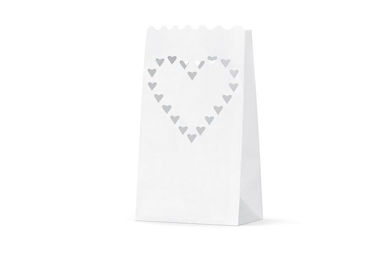 Lampiony na świece w kształcie torebek w kolorze białym, z motywem serca, wymiary 15x9x26 centymetrów. Wykonane z niepalnego papieru.(1 op. / 10 szt.)