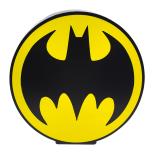 Okrągła lampa o wysokości 16 cm ma natychmiast rozpoznawalny żółto-czarny symbol nietoperza.