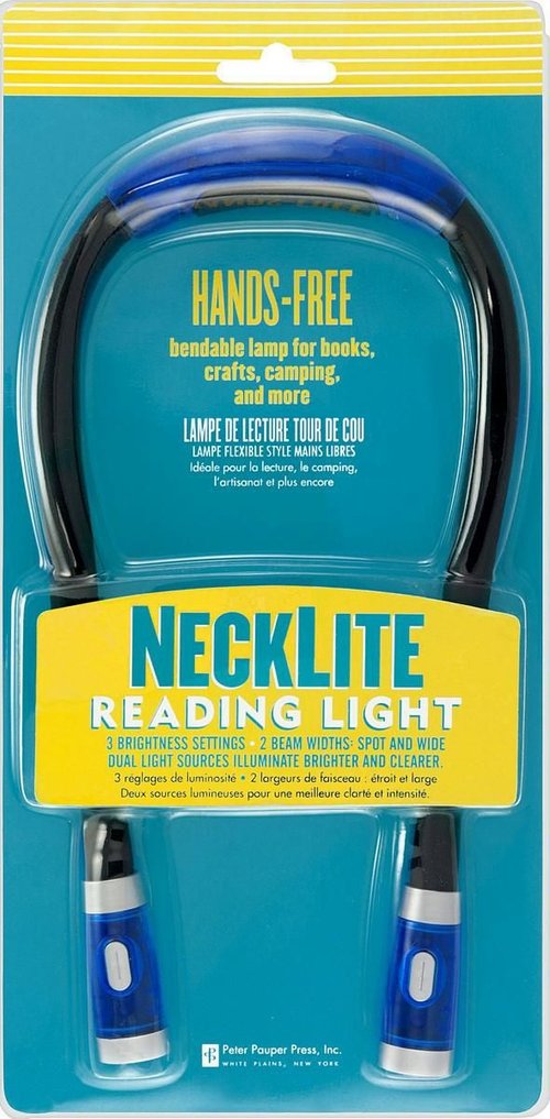 Nakładana na szyję lampka marki Peter Pauper Press. Idealna do czytania, majsterkowania, na biwak do podróży lub robienia na drutach. Elastyczną lampke można nosic na szyi, zawinąć wokoł przedmiotu lub postawić i używać jak zwykłej lampi na biurko. Podwójne lampki moga świecić pod różnymi kątami, zapewniając jaśniejsze oświetlenie i mniej cieni. W każdej końcowce znajdują się po 3 diony LED dające światło punktowe lub szerokokątne, możliwe są 3 ustawienia jasności. Natężenie światła 40 lumenów. Lampka posiada wygodną podkladkę pod szyję. Pokryte elastyczną, trwałą i miłą w dotyku gumą piankową ramiona wyginają się w dowolnych kierunkach, całkowita długość to 55,9cm. Lampka zasilana jest na dwie baterie AAA (nie dołączone do zestawu). Produkt nie jest zabawką i nie nadaje się dla dzieci poniżej 12-go roku życia.