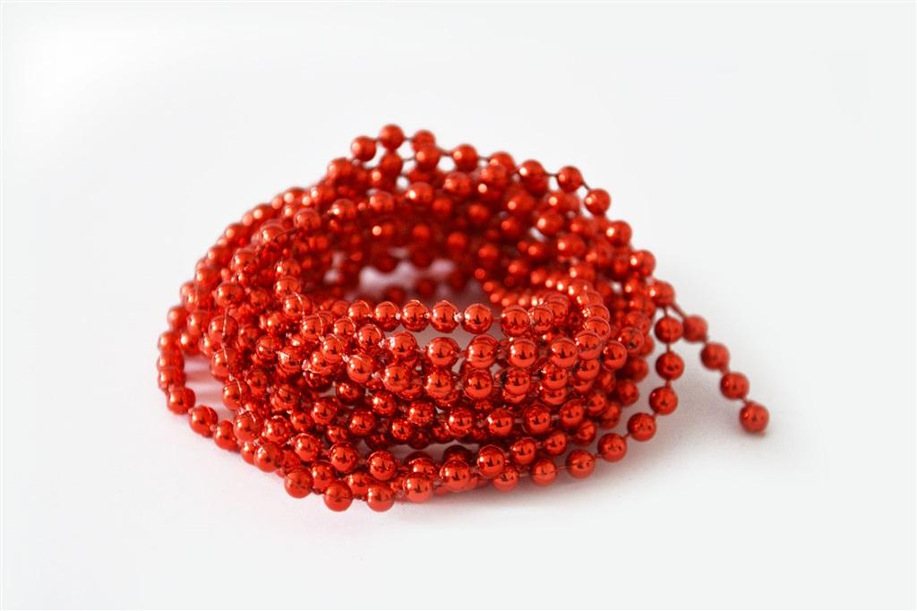 Łańcuch perełki - dekoracja choinkowa, długość ok. 270 cm. Średnica pojedynczej perełki ok. 6 mm. Kolor czerwony.