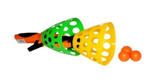 Gra zręcznościowa ""łapacz"" polegająca na wystrzeliwaniu piłki przy pomocy wyrzutni, którą następnie druga osoba musi złapać do ""koszyka"" przymocowanego do rękojeści. Podobnie jak w tenisie stołowym nadaje się do samodzielnych ćwiczeń poprzez odbijanie piłki o pionową przeszkodę. Produkt zapakowany w worek z siateczki. Zabawka przeznaczona dla dzieci od 6 lat.