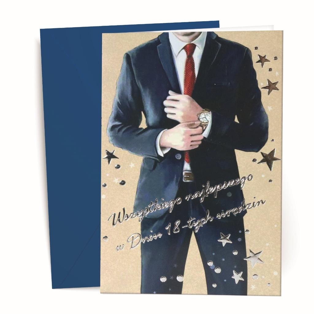 Kartka z kopertą, z życzeniami na 18 urodziny. Opakowana folią open.