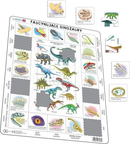 Układanka Maxi (36.5x28.5 cm) z grubej tektury ze specjalnymi kształtami, dzięki którym uczymy się nie tylko cierpliwości ale też języków, matematyki, geografii oraz wiedzy ogólnej. Czy jesteś nieustraszenie zafascynowany, czy raczej przestraszony i omdlały tą wspaniałą układanką z dinozaurami? Ta edukacyjna układanka przedstawia wiele naukowych faktów na temat gatunków dinozaurów. Wokół krawędzi znajdują się nazwy zarówno części ciała, jak i rzeczy istotnych/charakterystycznych dla gatunku. Układanka została kreatywnie podzielona na dwie części. Wewnętrzna część składa się z 15 tradycyjnych elementów z gatunkami dinozaurów: Welociraptor, Ankylozaur, Triceratops, T-Rex, Brontozaur, Spinozaur, Giganotozaur, Stegozaur, Allozaur, Nodozaur, Troodon, Barionyks i Parazaurolof. Wzdłuż zewnętrznej ramki druga część układanki to 20 elementów o unikalnie zakrzywionych krawędziach, z których każdy przedstawia część ciała lub rekwizyt związany z dinozaurami - z rzeczowymi informacjami pod każdym elementem. Każdy element jest dodatkowo indywidualnie opisany na ramce, wokół zewnętrznej części układanki. Ta układanka zawiera łącznie 35 elementów i jest przeznaczona dla nieco młodszych dzieci. Zapewni nie tylko rozrywkę, ale także pomoże rozwinąć wiedzę naukową i historyczną na temat dinozaurów. Firma Larsen od 75 lat tworzy wysokiej jakości układanki z grubej (4mm) tektury. Naszą ideą zawsze było tworzenie wysokiej jakości produktów dla dzieci, które są zarówno zabawne, jak i edukacyjne. Znajdujemy się w Flekkefjord, idyllicznym miasteczku w południowej Norwegii, w połowie drogi między Kristiansand i Stavanger. Cieszymy się że, dzięki współpracy z fińska firmą Tactic Oy, możemy oferować Państwu najwyższą jakość również w Polsce. Układanki Larsen odznaczają się -nietypowymi i jedynymi w swoim rodzaju wykrojnikami, które sprawiają wielką przyjemność z układania. -produkcją w Norwegii i wysoką jakością. -staranną selekcją obrazków dla każdego wieku -edukacyjnym charakterem układanek -zlokalizowanymi wzorami na wiele rynków.