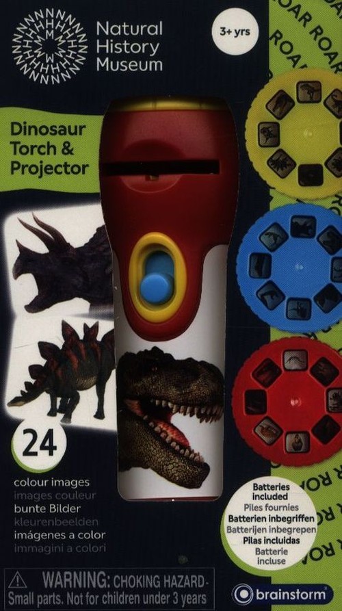 Ta poręczna latarka LED jest także projektorem fotograficznym, wyświetlającym kolorowe obrazy o szerokości do jednego metra na ścianach i sufitach.Zawiera 24 fascynujące obrazy dinozaurów, w tym T-Rex, Stegosaurus, Triceratops i inne.Latarka posiada 3 dyski  slajdów z 24 kolorowymi fotografiami. Łatwo wymieniaj i zmieniaj slajdy, odciągając plastikową klapkę i wkładając wybrany dysk, a następnie obracaj dysk, aby oglądać fantastyczne kolorowe obrazy o szerokości do jednego metra. Obrazy można łatwo ustawić, obracając głowicę obiektywu. Może być również używana jako zwykła latarka bez założonych prowadnic i doskonale nadaje się do trzymania na stolikach nocnych, aby zapewnić dzieciom komfort w nocy. Mierzy 11 cm długości i około 3,5 cm średnicy w najszerszym miejscu. Zasilana bateriam i- 2 x AAA załączonymi w zestawie.