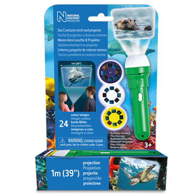 Ta fantastyczna latarka to również projektor, który wyświetla ekscytujące obrazy stworzeń morskich takich jak płetwal błękitny, ryba błazenek, rozdymka, ośmiornica, wydra morska i żarłacz biały. Zobacz te żywe postacie na ścianach i sufitach świetny towarzysz przed snem, dzięki któremu zasypianie będzie przyjemniejsze. Do latarki dołączone są trzy slajdy z 24 kolorowymi obrazami. Z łatwością wymieniaj i zmieniaj slajdy, odciągając plastikową klapkę i wkładając wybrany dysk, a następnie obracając dysk, aby wyświetlić fantastyczne obrazy o szerokości do jednego metra. Obrazy można łatwo ustawić, obracając głowicę obiektywu. Produkt ten może być używany jako zwykła latarka bez założonych slajdów i doskonale nadaje się do przechowywania na stolikach nocnych, aby zapewnić dzieciom komfort w nocy. Latarka ma 11 cm długości i około 3,5 cm średnicy w najszerszym miejscu. Zasilana bateriami - 3 x LR44 załączonymi w zestawie.
