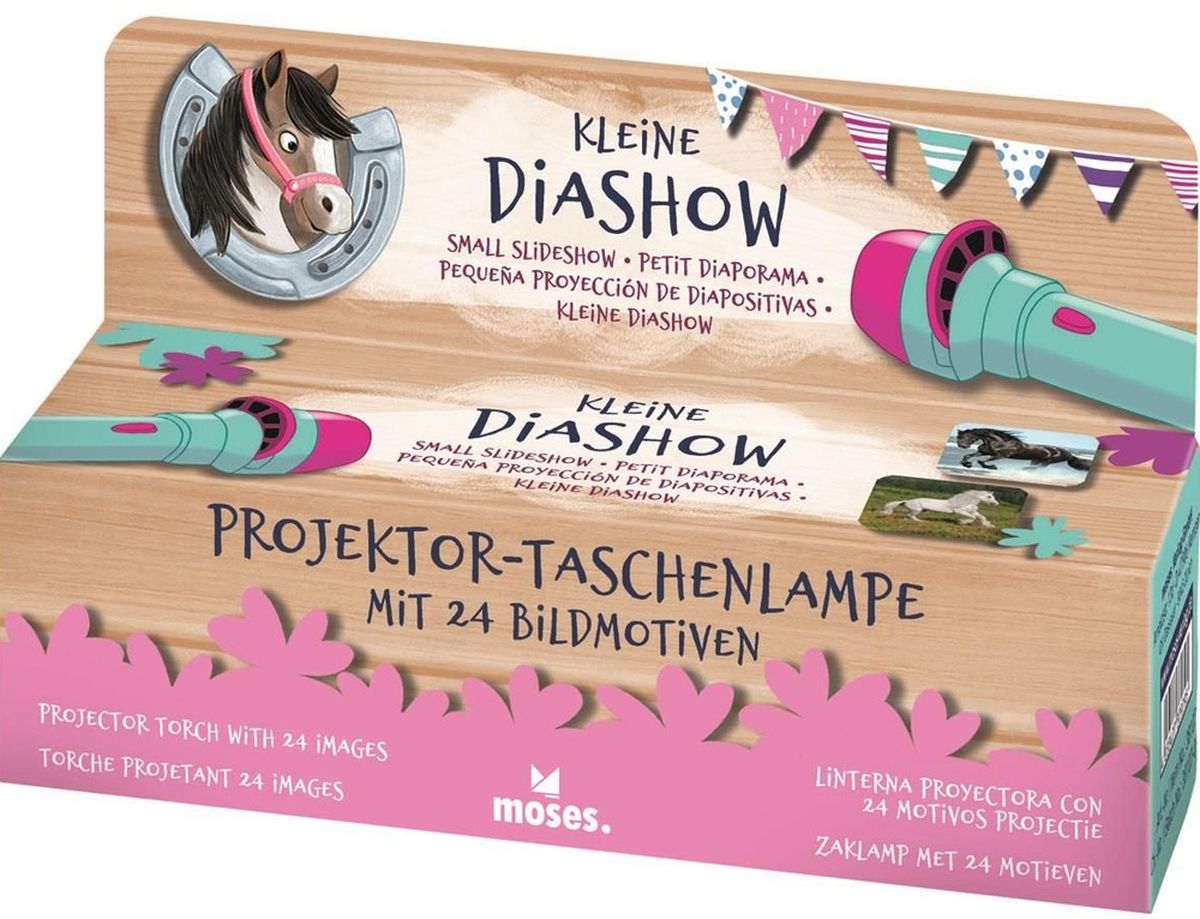 Wspaniały prezent dla fanów koni, niezwykły pokaz koni i kucyków, który możesz przenieść do pokoju dziecinnego za pomocą latarki - projektora. W tym celu należy włączyć latarkę, wsunąć kółeczko z przeźroczami w szczelinę powstałą po odciągnięciu ruchomej części i skierować na ścianę w zaciemnionym pokoju.Niezwykły pokaz.Wyświetla 24 obrazy, po 8 barwnych zdjęć (3 kółeczka z przeźroczami).Zawiera wizerunki koni i kucyków, nawet tych z mniej znanych ras: źrebięta Haflinger, kucyki szetlandzkie czy norweski koń fiordzki.Idealna widoczność.Wymiary produktu: 12 cm x 3 cm x 3 cm.Wymiary opakowania: 13,5 cm x 8 cm x 4 cm.Przeznaczony dla dzieci powyżej lat 3.Nigdy nie świecić bezpośrednio w oczy.