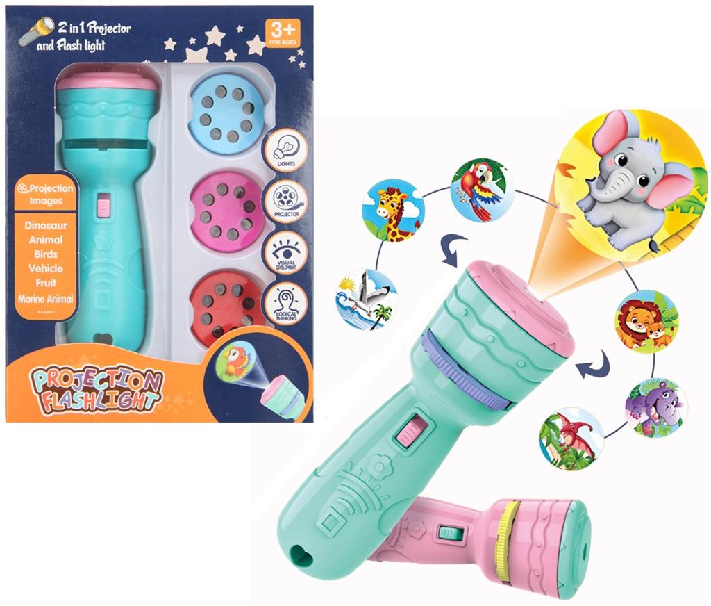 Latarka z projektorem to wspaniała zabawka dla dzieci. Po włożeniu do projektora jednej z trzech dołączonych płytek dziecko może oglądać na ścianie kolorowe, bajkowe obrazki.