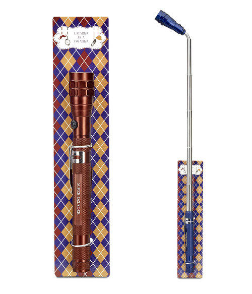 latarka teleskopowa o lekkiej konstrukcji z przedłużeniem do 57 cm ze specjalną dedykacją dla Dziadka elastyczne zgięcie 360??° wbudowany magnes 3 białe diody LED niezbędna w pracy każdego majsterkowicza, znajdzie zastosowanie każdym warsztacie oraz w każdym domu znajdzie każdy przedmiot, który pozostał w słabo dostępnym miejscu metalowy klips po jednej stronie umożliwia łatwe zawieszenie latarki na pasku wymiary: - długość: 17,4 cm - długość z przedłużeniem: do 57 cm