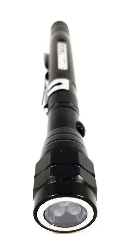 Latarka teleskopowa czarna. Zasilana 4 bateriami AG13 (w zestawie). Z końcówką magnetyczną do wyciągania drobnych, metalowych przedmiotów
