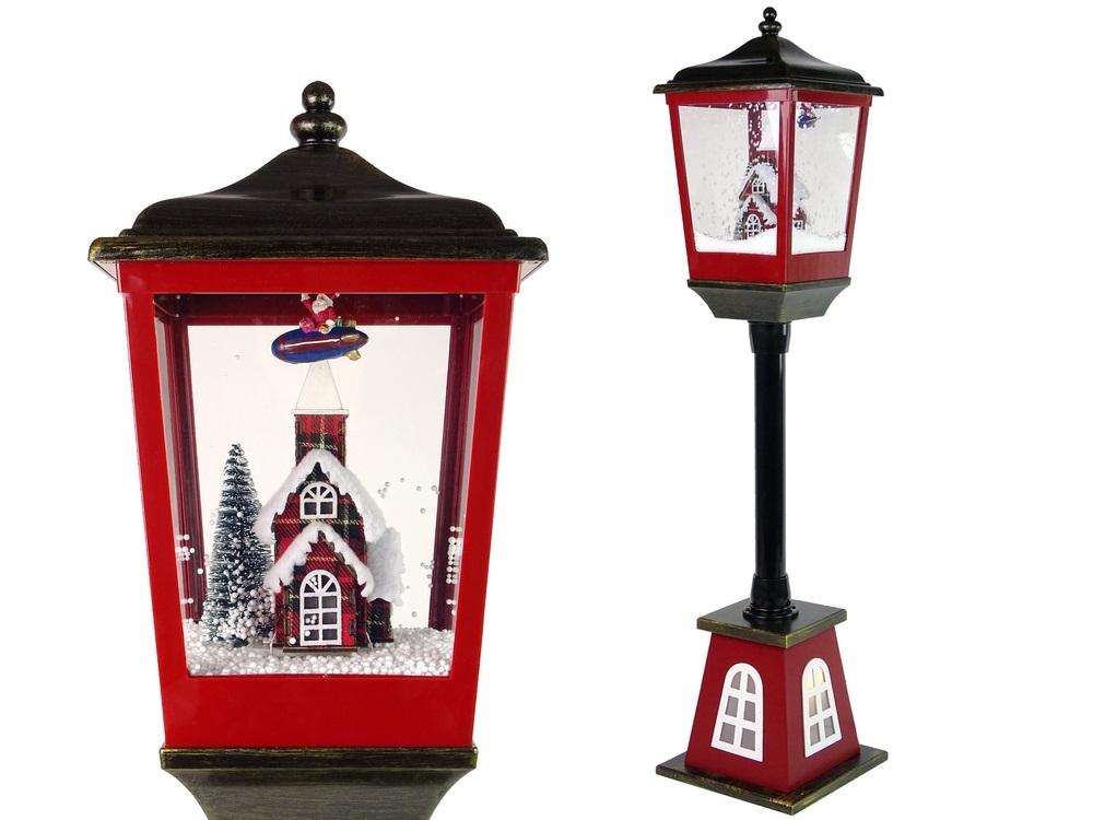 Przepiękna ozdoba świąteczna, która ozdobi Twój dom na nadchodzące święta. Wprowadzi ciepły i rodzinny nastrój do Twojego domu, tworząc go przytulnym i dodając świątecznego ducha. Idealna dekoracja również do centrów handlowych bądź sklepów, aby osoby robiące zakupy poczuły już klimat świąt Bożego Narodzenia.Latarnia ma piękne wzory i czerwony kolor, charakterystyczny dla tego okresu. Wykonana z trwałego plastiku, przez co jest lekka i wytrzymała, bożonarodzeniowa ozdoba może być używana co roku, co czyni ją bardzo ekonomicznym wyborem i zakupem na lata. Pompa znajdująca się wewnątrz transportuje śnieg z podstawy i rozpyla go od góry, dając wrażenie padającego śniegu.Wewnątrz znajduje się wesoły Święty Mikołaj z bałwankiem na huśtawce równoważnej, z tyłu znajduje się wysoki komin ceglany z choinką, z niego wydobywa się sztuczny śnieg, wszystko wskazuje na symbole świąt.To nie wszystkie funkcje.Latarnia ma 2 różne opcje wysokości, dzięki różnym kombinacją, możesz wybrać dowolne miejsce w swoim pomieszczeniu.Oprócz sypiącego śniegu ma funkcję dźwiękowe i świetlne. Świeci w zimowe wieczory doda klimatu i zastąpi oświetlenie pomieszczenia. Wbudowane dwa tryby pozostawiają wybór, czy latarnia świeci wraz ze świątecznymi kolędami i śniegiem lub druga opcja wyłącznie efekt sypiącego śniegu i światła, bez melodii. Zmienisz to przyciskając drugi raz guziczek on/off.W podstawie latarni, również świecą się światełka.