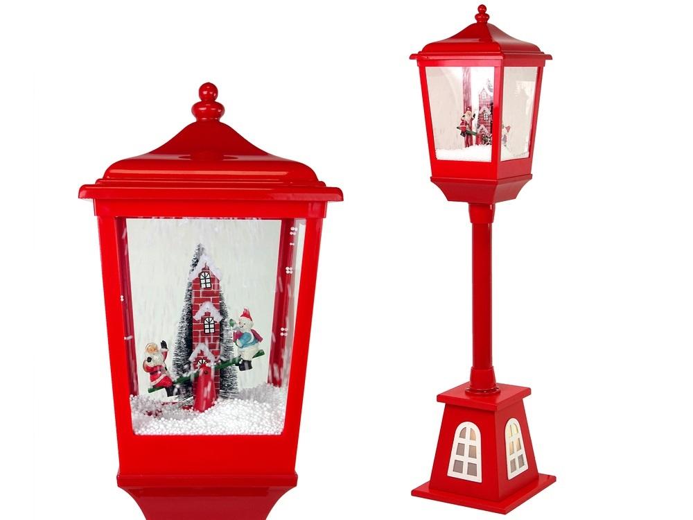 Przepiękna ozdoba świąteczna, która ozdobi Twój dom na nadchodzące święta. Wprowadzi ciepły i rodzinny nastrój do Twojego domu, tworząc go przytulnym i dodając świątecznego ducha. Idealna dekoracja również do centrów handlowych bądź sklepów, aby osoby robiące zakupy poczuły już klimat świąt Bożego Narodzenia.Latarnia ma piękne wzory i czerwony kolor, charakterystyczny dla tego okresu. Wykonana z trwałego plastiku, przez co jest lekka i wytrzymała, bożonarodzeniowa ozdoba może być używana co roku, co czyni ją bardzo ekonomicznym wyborem i zakupem na lata. Pompa znajdująca się wewnątrz transportuje śnieg z podstawy i rozpyla go od góry, dając wrażenie padającego śniegu.Wewnątrz znajduje się wesoły Święty Mikołaj z bałwankiem na huśtawce równoważnej, z tyłu znajduje się wysoki komin ceglany z choinką, z niego wydobywa się sztuczny śnieg, wszystko wskazuje na symbole świąt.To nie wszystkie funkcje.