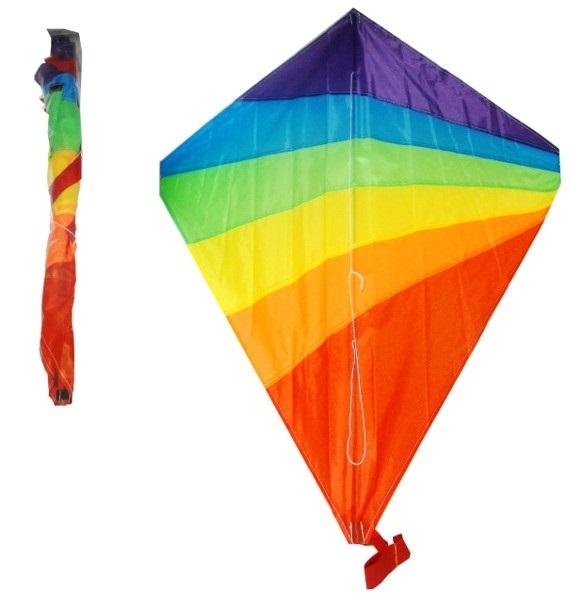 Kolorowy latawiec w paski do puszczania podczas słonecznych, trochę wietrznych dni. Produkt zapakowany w przezroczysty worek. Produkt dla dzieci od 3 lat.