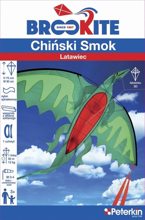 CHIŃSKI SMOK to fantazyjny, jednolinkowy latawiec 3D, wykonany z nylonu spinakerowego. Posiada wsporniki z włókna szklanego oraz plastikowy uchwyt do nawijania na końcu linki. Przeznaczony do puszczania przy słabym i umiarkowanym wietrze 2-4 BF. Latawiec zapakowany jest w solidny, winylowy futerał z kartonową etykietą oraz instrukcją montażu. Brookite to firma produkująca latwace od 1907 r. Wszystkie latawce uszyte są z lekkich, wysokiej jakości materiałów, używanych między innymi do produkcji żagli. Dla dzieci w wieku od 3 lat