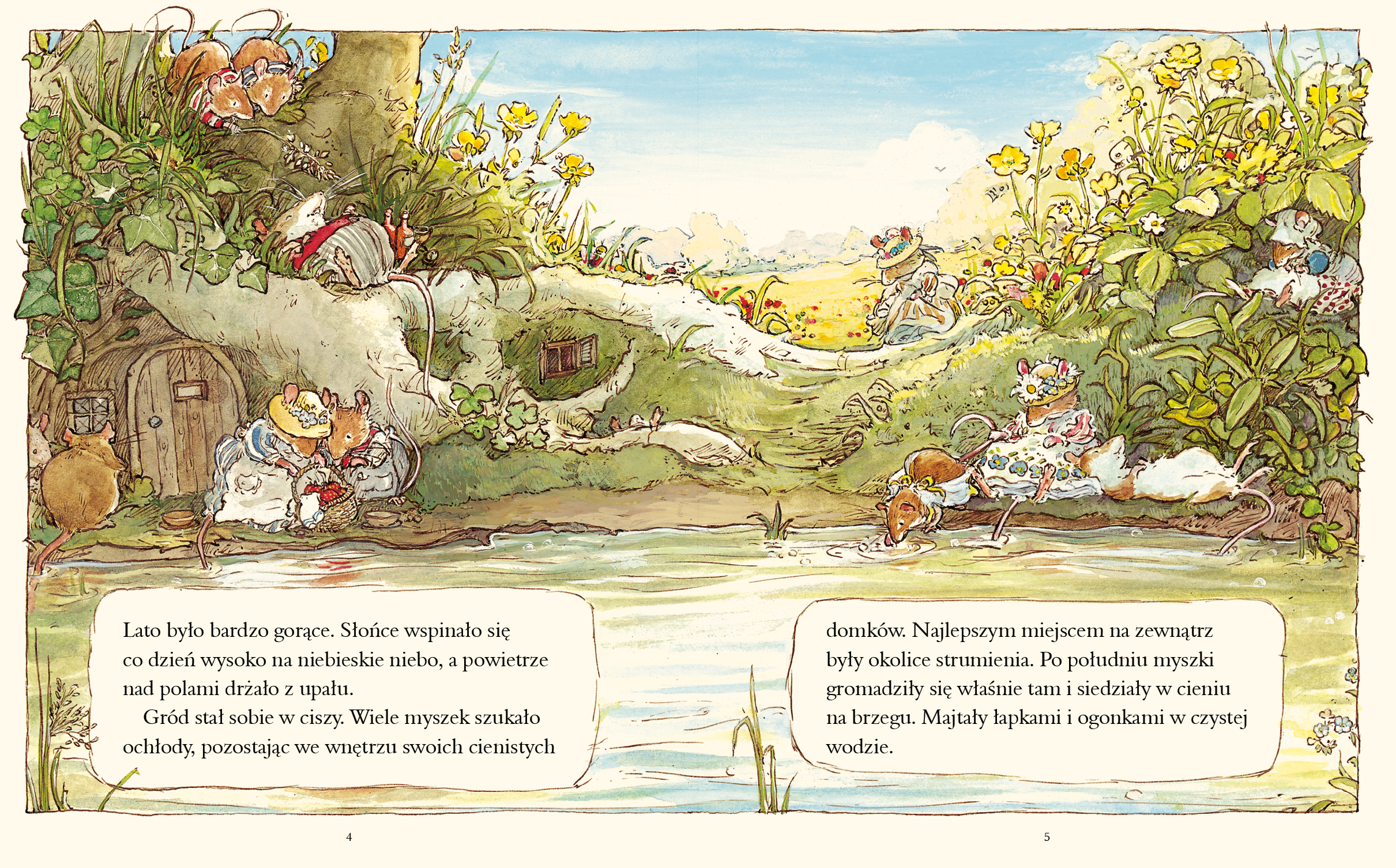 Lato było bardzo gorące. Słońce wspinało się co dzień wysoko na niebie, a powietrze nad polami drżało z upału. Wiele myszek gromadziło się po południu w okolicach strumyka i szukało tam ochłody. Majtały łapkami i ogonkami w czystej wodzie. Letnie lenistwo przerwała fantastyczna wiadomość - oto panna Makóweczka Bystrzycka i pan Dereń Mączniak biorą ślub, a wesele odbędzie się nad strumieniem!