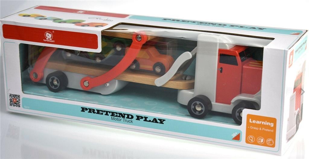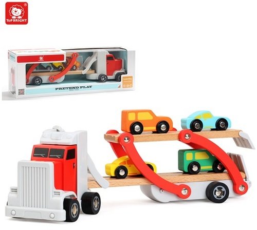 Drewniany TIR z lawetą i samochodzikami firmy TOP BRIGHT. Górna część lawety opuszcza się w dół tworząc tym samym rampę po której można zjeżdżać samochodzikami. W zestawie z TIR’em dołączone są 4 samochodziki. Laweta wykonana jest z bezpiecznych, ekologicznych materiałów - wysokiej jakości drewna oraz wysokiej jakości nietoksycznego plastiku. Ma ładne żywe kolory i gładkie krawędzie. Barwiona jest nietoksycznymi farbami na bazie wody. Wymiary zabawki: 38x11x9cm. Wymiary opakowania: 42x14x11 cm. Zabawka przeznaczona dla dzieci: 36M+.
