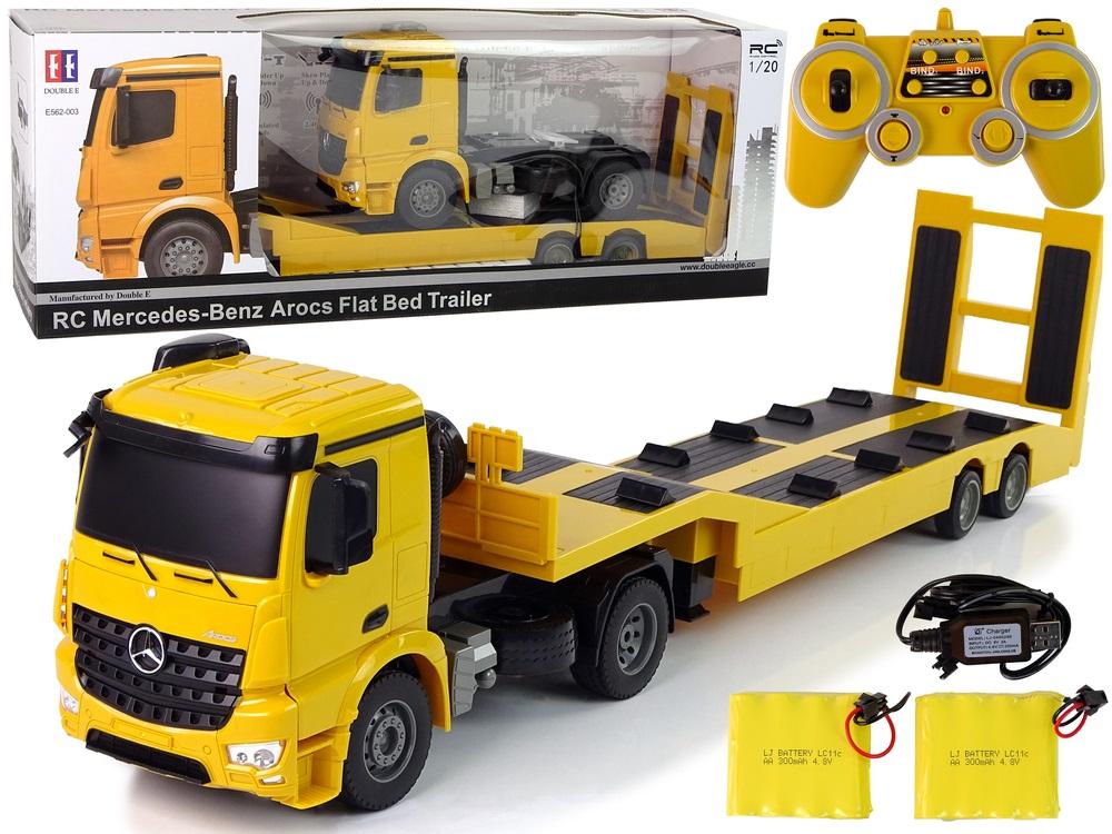 Duża Ciężarówka Laweta R/C Mercedes Arocs Żółta 1:20 Długość 103 cm Duży tir zdalnie sterowany z lawetą niskopodwoziową Mercedes Arocs wykonany jest z najwyższą dokładnością detali w stosunku do pierwowzoru. Ciężarówka przypomina prawdziwy odpowiednik, który jeździ po drogach. Maluch w trakcie zabawy obserwuje jej wygląd, cechy oraz budowę. Teraz w domu może mieć swoją miniaturową wersję. Wykonana jest w skali 1:20. Zabawa z jej wykorzystaniem wpłynie na wyobraźnię i kreatywność dziecka. Zestaw licencjonowana ciężarówka Mercedes-Benz sprawdzi się podczas przewożenia różnych przedmiotów, pojazdów bądź zabawek. Podczas pracy wydaje realistyczne odgłosy. Dzięki pilotowi pracującemu na częstotliwości 2,4 GHz zapewnia pełne sterowanie ciągnikiem i naczepą. Niezbędny wszędzie tam gdzie trzeba dowieźć ciężki sprzęt i najróżniejsze elementy na budowę. Laweta ma opuszczane podwozie, autka bez problemu wjadą na rampę. Cechy charakterystyczne: - Skala: 1:20 - Pilot: 2,4 G - Czas zabawy: do 20 minut - czas ładowania: 80 minut - Zasięg pilota: około 20 m - Prędkość: do 10 km/h , możliwość regulowania prędkości na pilocie - bardzo realistyczny odgłos pracy silnika w pojeździe - przednie i tylne światła - sygnał klaksonu - gumowe opony - możliwość jazdy samą kabiną lub wraz z lawetą - Naczepa i kabina mogą być sterowane jednocześnie lub oddzielone -kabina ma możliwość poruszania się w przód, tył i na boki - tylne pochyłe podnoszenie/opuszczanie płyty Elementy zestawu: - ciężarówka Mercedes-Benz - pilot do zdalnego sterowania - akumulator 2 x 4,8V 300mAh - ładowarka do akumulatorka - instrukcja obsługi Wymiary kabiny/ciągnika: 32 cm x 14 cm x 18 cm Wymiary naczepy: 80 cm x 14 cm x 14 cm Wymiary całości: 103 cm x 14 cm x 18 cm Wymiary pudełka: 74 cm x 28 cm x 18 cm Ciężarówka zasilana jest dwoma akumulatorkami 4,8 V (w zestawie), natomiast pilot do zdalnego sterowanie potrzebuje dwóch baterii AA 1.5 (brak w zestawie). Pojazd przeznaczony jest dla dzieci powyżej 6. roku życia. Zestaw zapakowany jest w kartonowe pudełko z przezroczystą witrynką, dzięki czemu idealnie nadaje się na prezent.