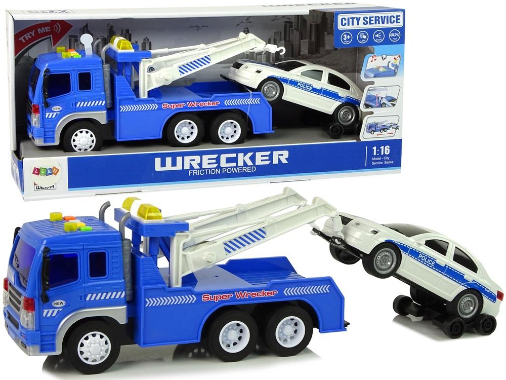 Autko na górze kabiny posiada cztery przyciski. Koguty ostrzegawcze na górze informują o poruszaniu, na górze przycisku odpowiadają za dźwięki- klaksonu, wciągania autka z alarmem, cofania. Cała ciężarówka ma kolor niebieski z białymi elementami. Auto policyjne jest w kolorze białym z charakterystycznymi naklejkami. Laweta posiada frykcyjny napęd tylnej osi na popych, wystarczy nacisnąć na tył, puścić do przodu i cieszyć się prędkością.