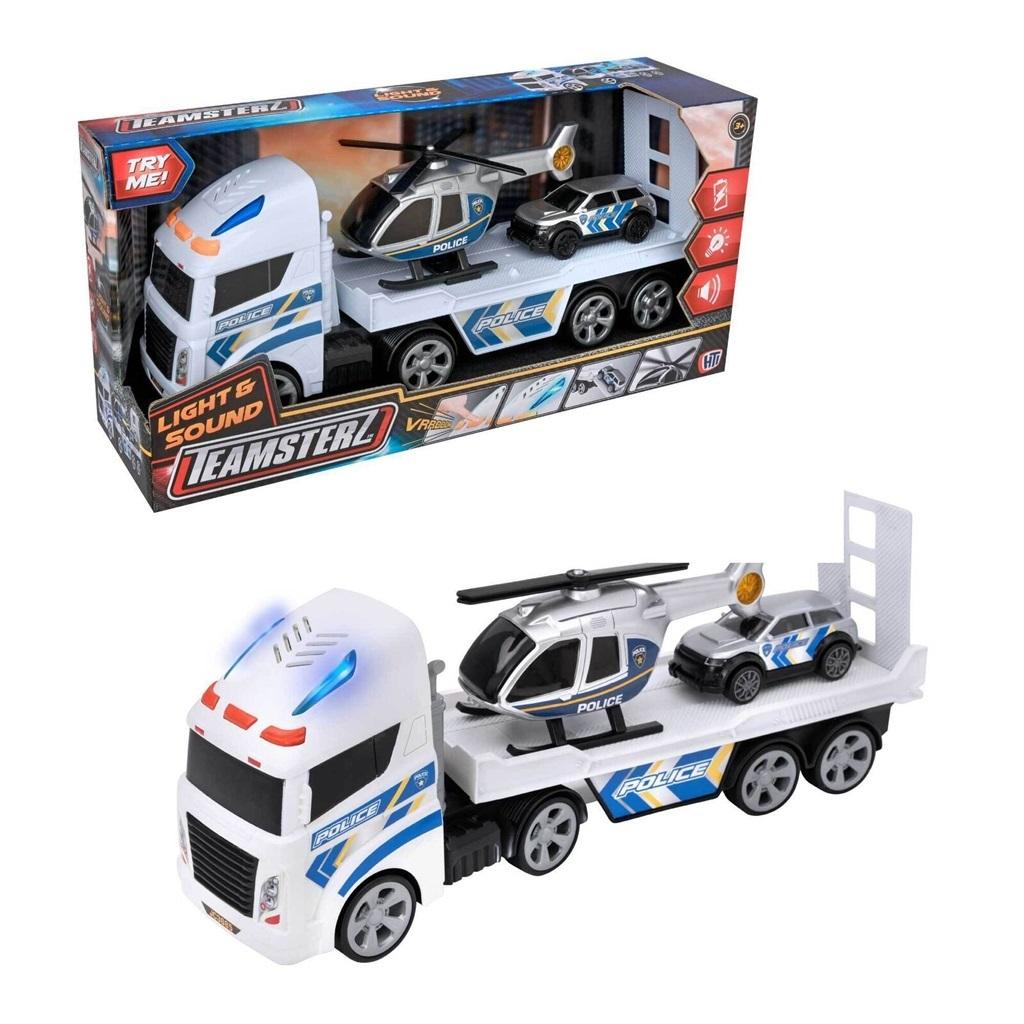 • w zestawie 3 pojazdy: laweta na baterie, helikopter, samochód policyjny;