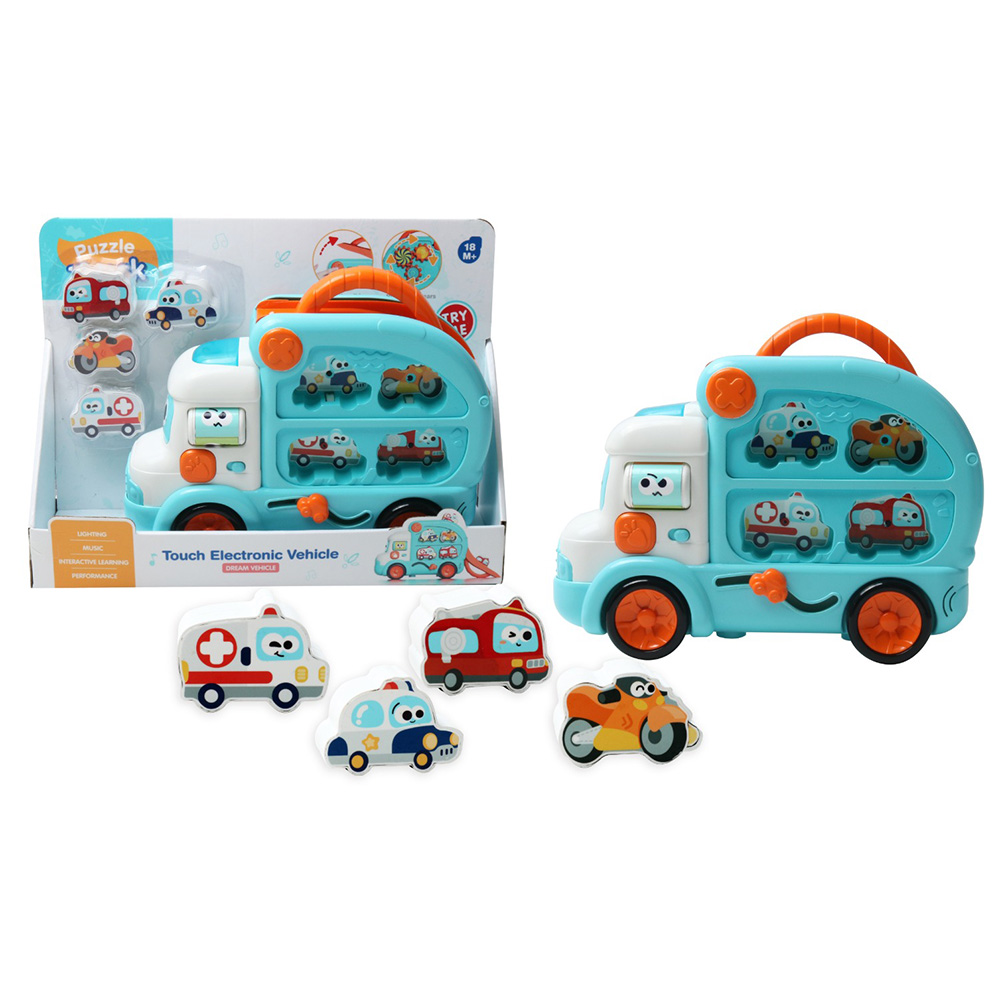 Samochód laweta - sorter kształtów W zestawie 4 pojazdy, które dziecko może dopasować kształtem do odpowiednich otworów. Autko może pełnić funkcję lawety, z efektami świetlnymi i dźwiękowymi wymiary opakowania: 34 x 9.5 x 25 cm Wiek 18m+