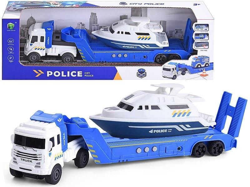 auto z lawetą i łodzią policyjną, napęd na koło zam, z dźwiękiem; 37x13x7,5cm, W/B