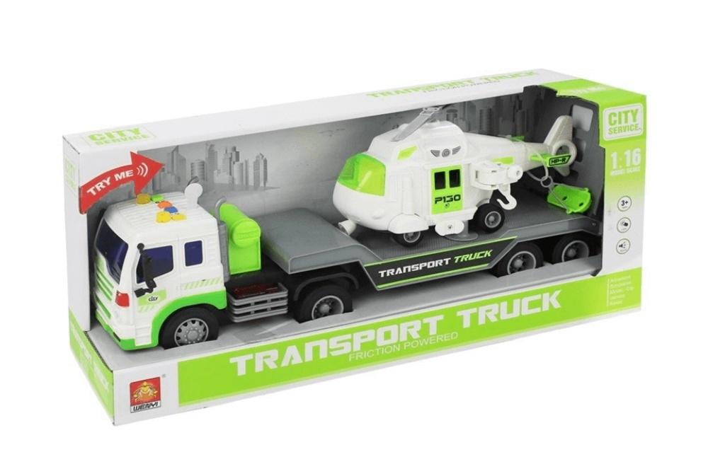 Ciężarówka z lawetą i helikopterem to wspaniały prezent dla małego fana motoryzacji. Model został wykonany z plastiku z dbałością o szczegóły. Pojazd posiada 4 przyciski na kabinie, które odpowiadają za efekty świetlne i dźwięki wydawane w trakcie zabawy. Auto porusza się dzięki napędowi ręcznemu.