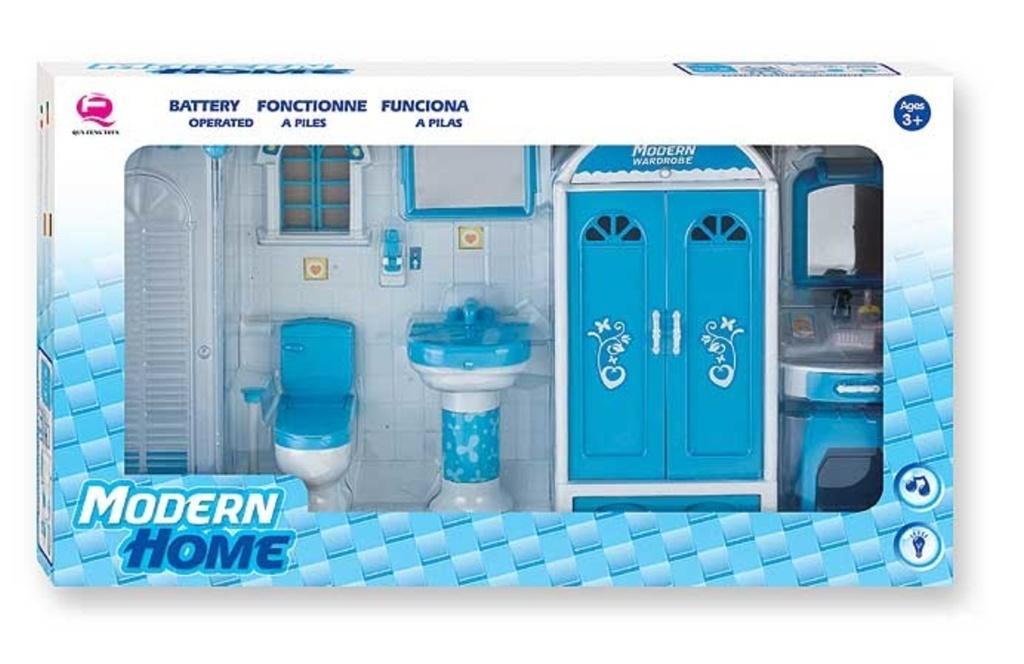 Łazienka w kolorze niebieskiem z szafą, toaletką, umywalką i innymi akcesoriami, Doskonała do zabawy z lalkami.
